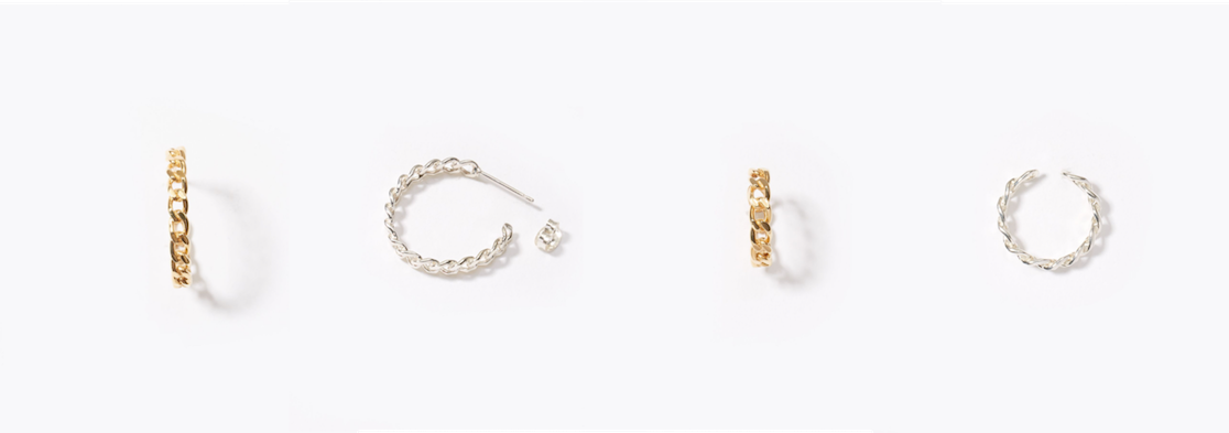 (耳元上から)"code" curve chain ear cuff 8,640yen (with tax) / "bone" organic mini hoop pierced earring 6,480yen (with tax) / "bone" organic small hoop pierced earring 10,800yen (with tax) / "code" curve chain pierced earring 12,960yen (with tax)