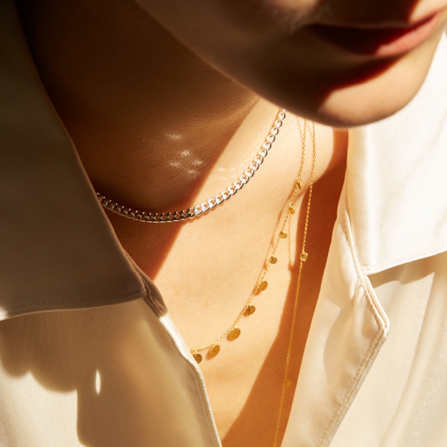 "code" curve chain silver choker 27,000yen (with tax) / "krishna" K10 coin short necklace 39,960yen (with tax) / "krishna" K10 coin long necklace 89,640yen (with tax)