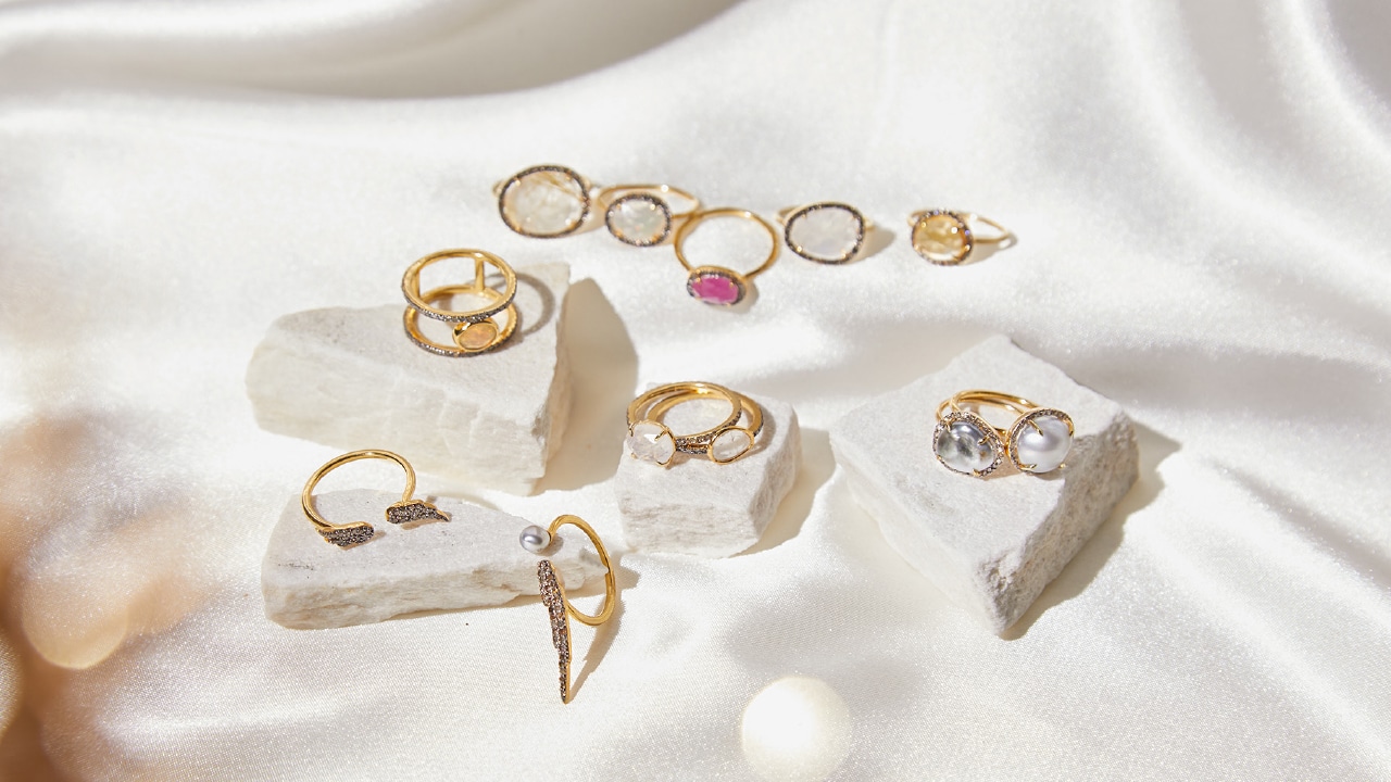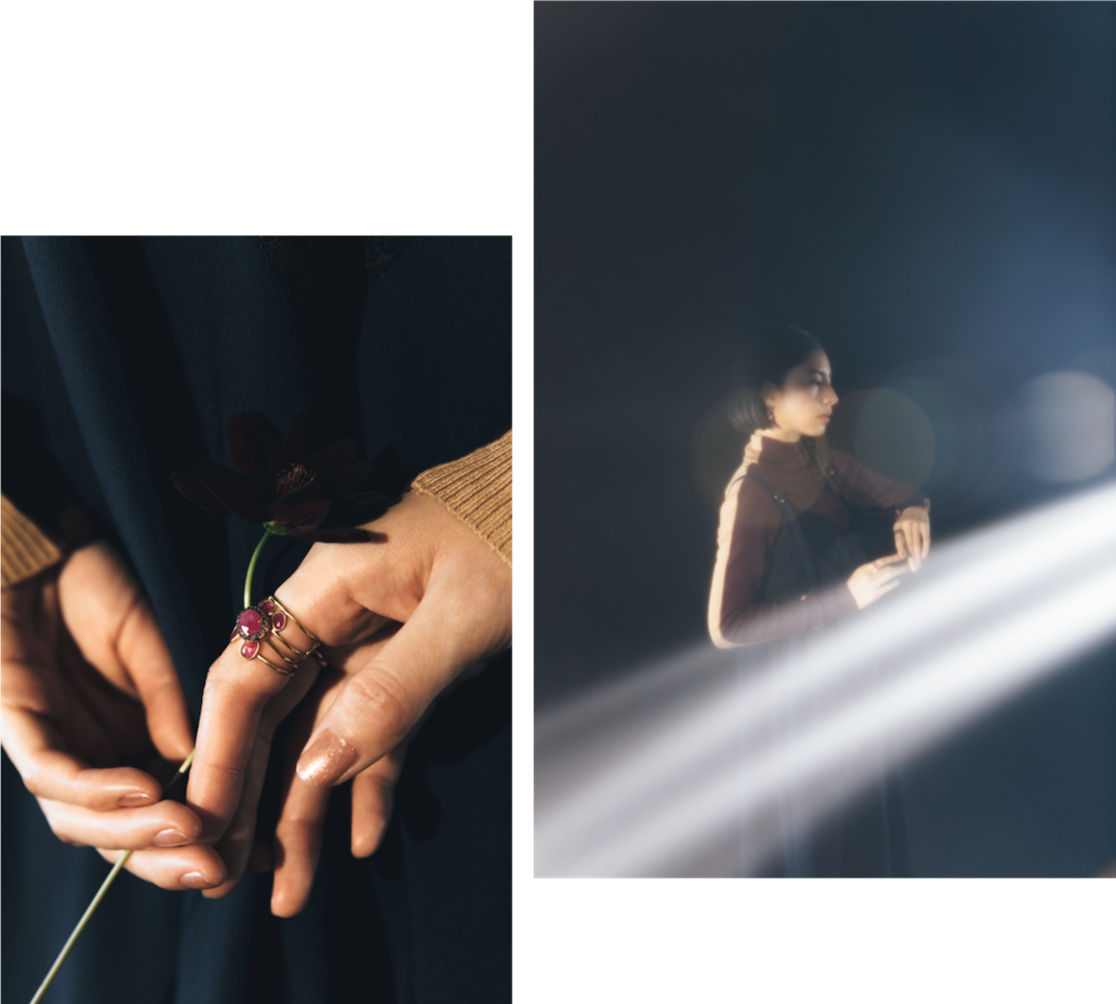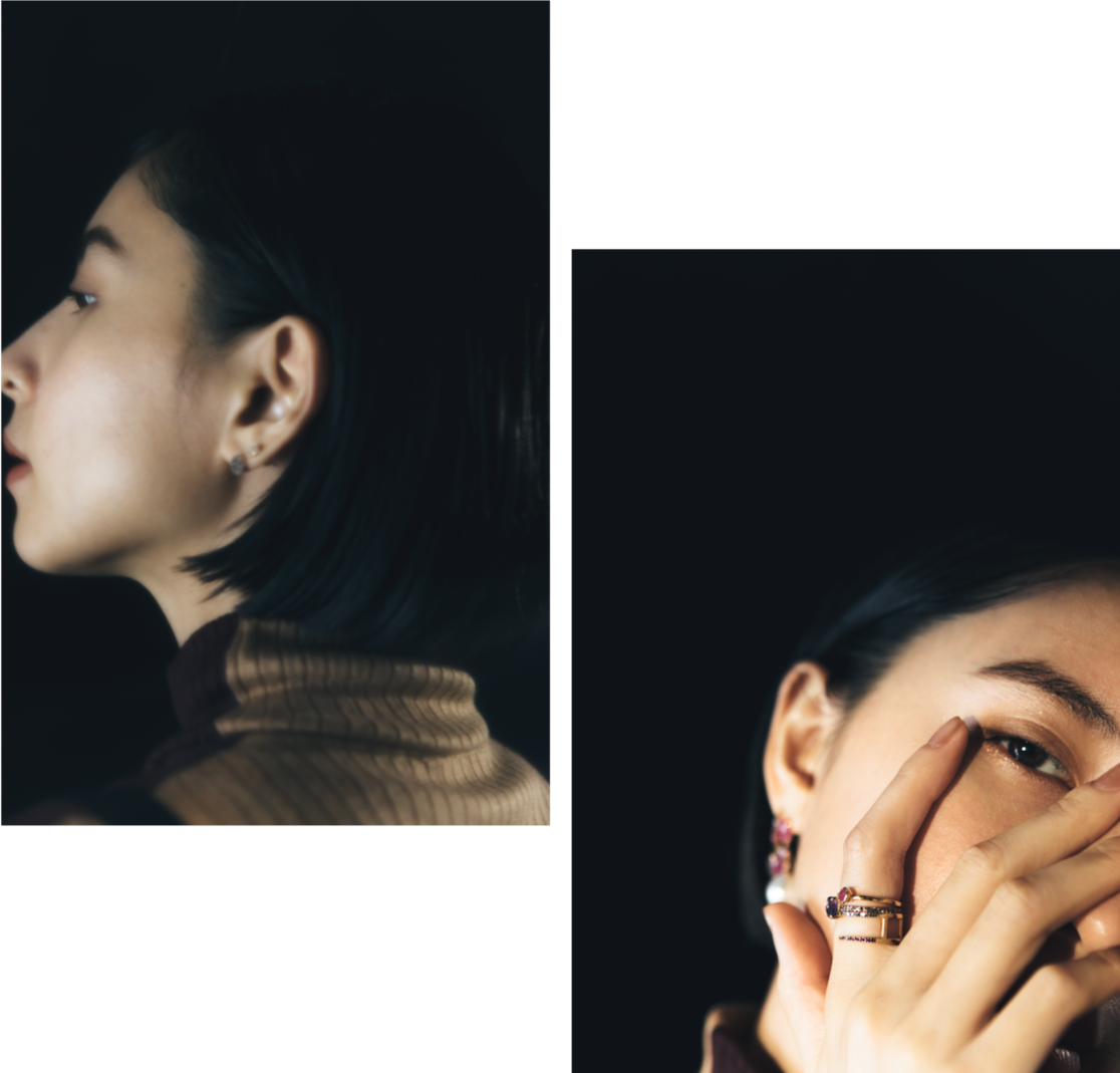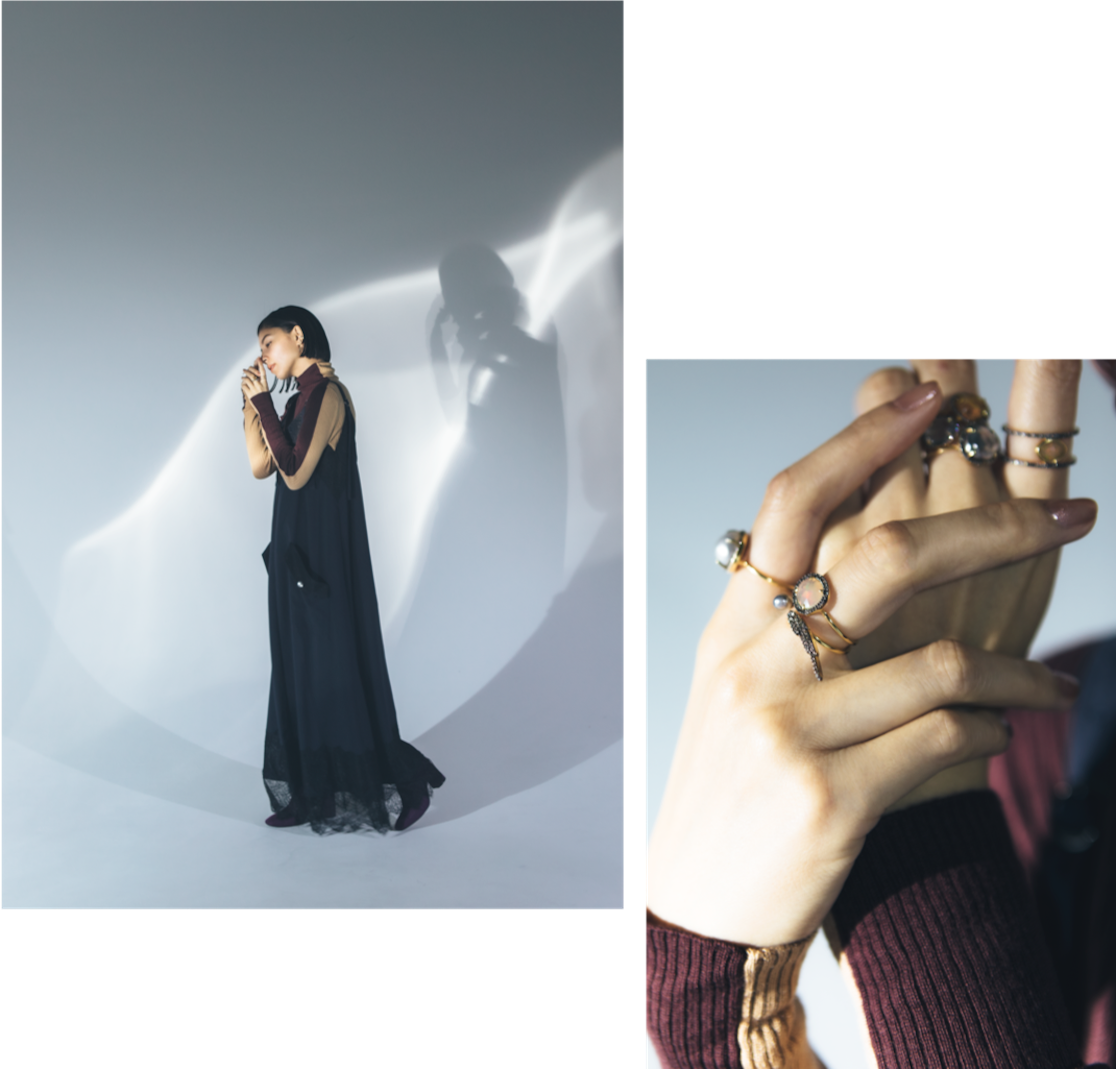 ジュエリーは、一番肌に近いものという感覚ですね。透き通ったシックな色味が好きで、今回撮影で着用したものだと、ケシパールやシトリン、ホワイトオパールのリングがお気に入りです。小さな宝石が私の指先を守ってくれているような、そんな気持ちになります。