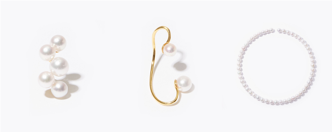 "philia" akoya reverse single pierced earring 17,600yen (with tax) / "philia" akoya double pearl cuff 15,400yen (with tax) / "philia" akoya strand choker 35,200yen (with tax)