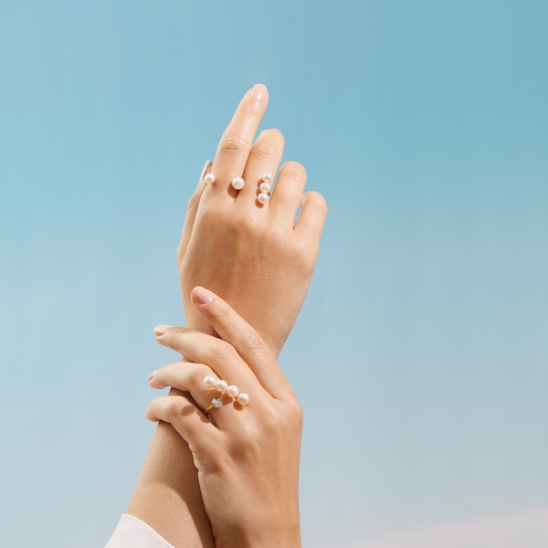 パールの華やかさが光る、モダンなダブルフィンガーリング。オープンリングは”selene”のダイヤモンドパヴェモチーフを添えて。