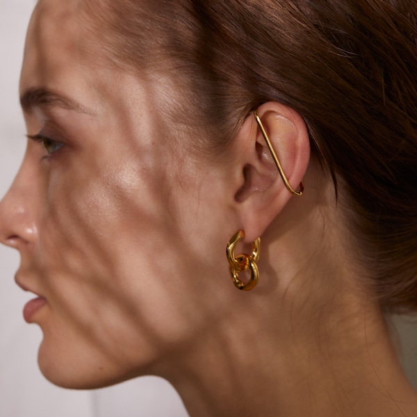 今回発売するのは、まるで発掘された古代王朝の金の宝石のように、表面に独特のテクスチャーをいれたジュエリーシリーズです。ボリューミーなゴールドのジュエリーは、一点取り入れるだけでスタイリングのポイントになるところが魅力。敢えて少し歪なシェイプにしているデザインもあり、古代の風合いを感じさせつつもモダンなルックに仕上げました。ひとつひとつご紹介していきます。