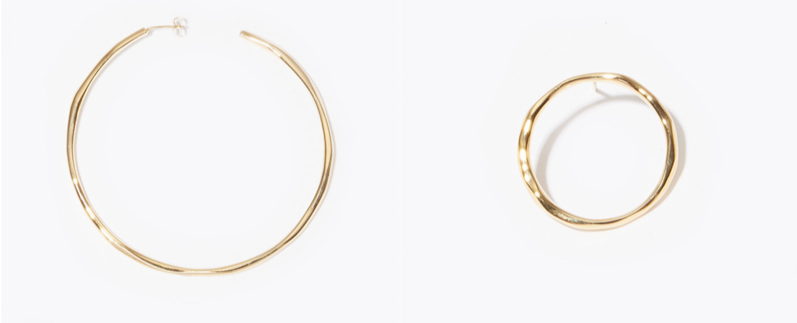 こちらは、内径(フープの内側の直径)がなんと6.8cmもあるビッグフープピアス。以前、細いラインのビッグフープを発売したことがありますが、こちらはフープ自体にも厚みがあり、さらにテクスチャーを加えました。アップヘアではもちろん、髪を下していても十分な存在感を放ちます。