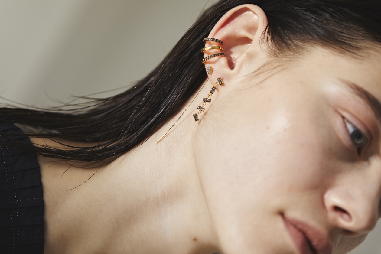 母なる大地を象徴する“gaia”シリーズに、新作が加わります。いずれもブラウンダイヤ×ブラックロジウムのシックな煌めきが魅惑的。サークルモチーフや立体的なフォルムが、フューチャリスティックなジュエリーです。