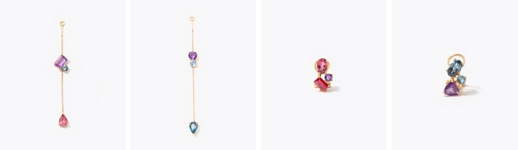 (左の2点)チェーンのイヤーチャームは、カラーストーンをランダムに配置しました。シンプルなカラーストーンやダイヤモンドのスタッドピアスは、お手持ちのピアスと一緒にお楽しみください。
