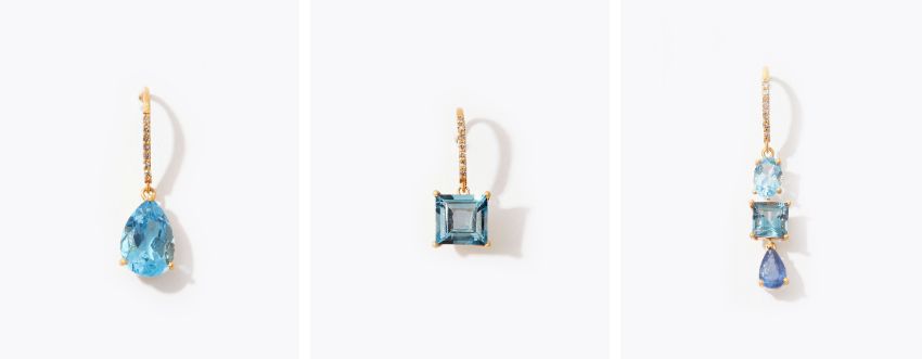 "eden" K10 pear shape blue topaz pave diamond single pierced earring 19,800yen (with tax) / "eden" K10 square london blue topaz pave diamond single pierced earring 20,900yen (with tax) / "eden" K10 blue and london blue topaz blue sapphire pave diamond single pierced earring 26,400yen (with tax)