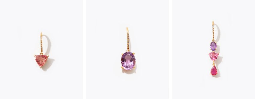 "eden" K10 triangle pink tourmaline pave diamond single pierced earring 22,000yen (with tax) / "eden" K10 oval amethyst pave diamond single pierced earring 19,800yen (with tax) / "eden" K10 amethyst pink tourmaline ruby pave diamond single pierced earring 26,400yen (with tax)
