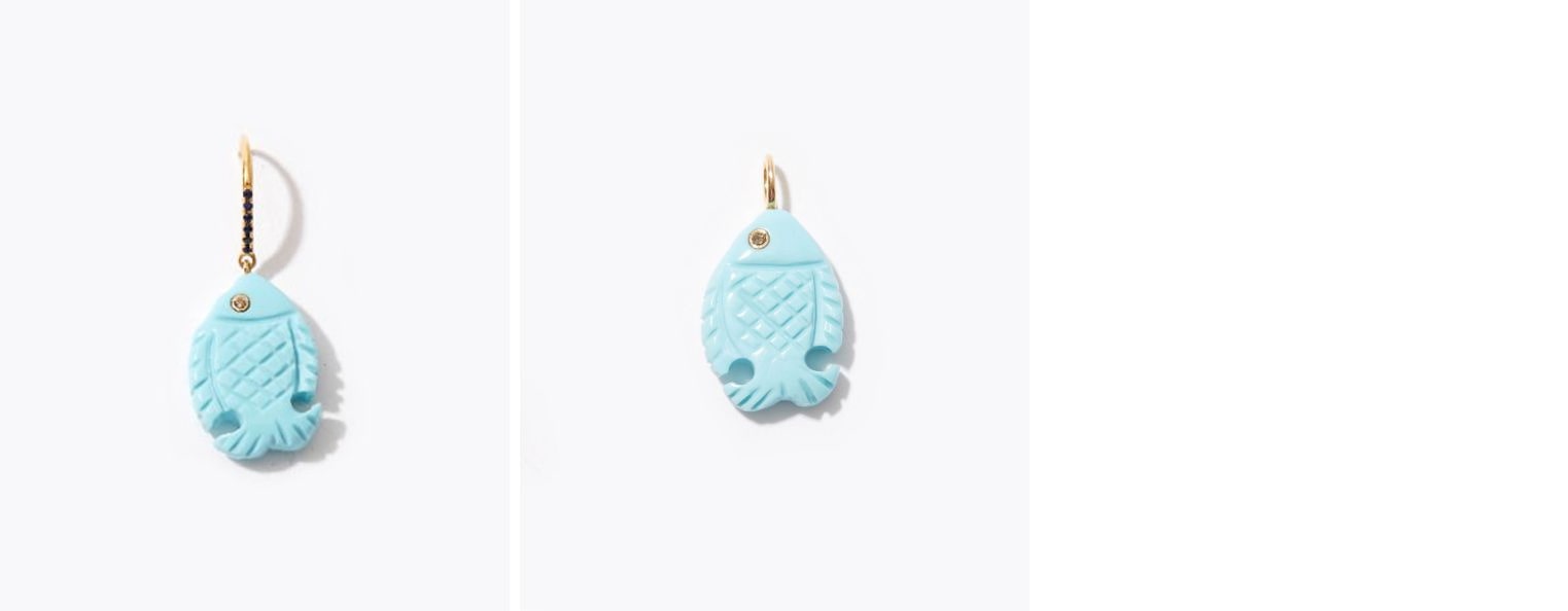 まるで地中海のように、鮮やかな碧のターコイズ。愛らしい魚モチーフのカーヴィングをほどこし、覆輪巻きにしたダイヤモンドの目を両側に埋め込みました。ピアスはフック部分にブルーサファイアもあしらいました。チャームは、ネックレスはもちろん、小さなフープピアスに通しても愛らしいです。