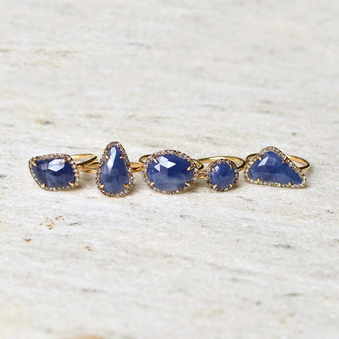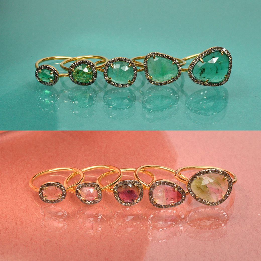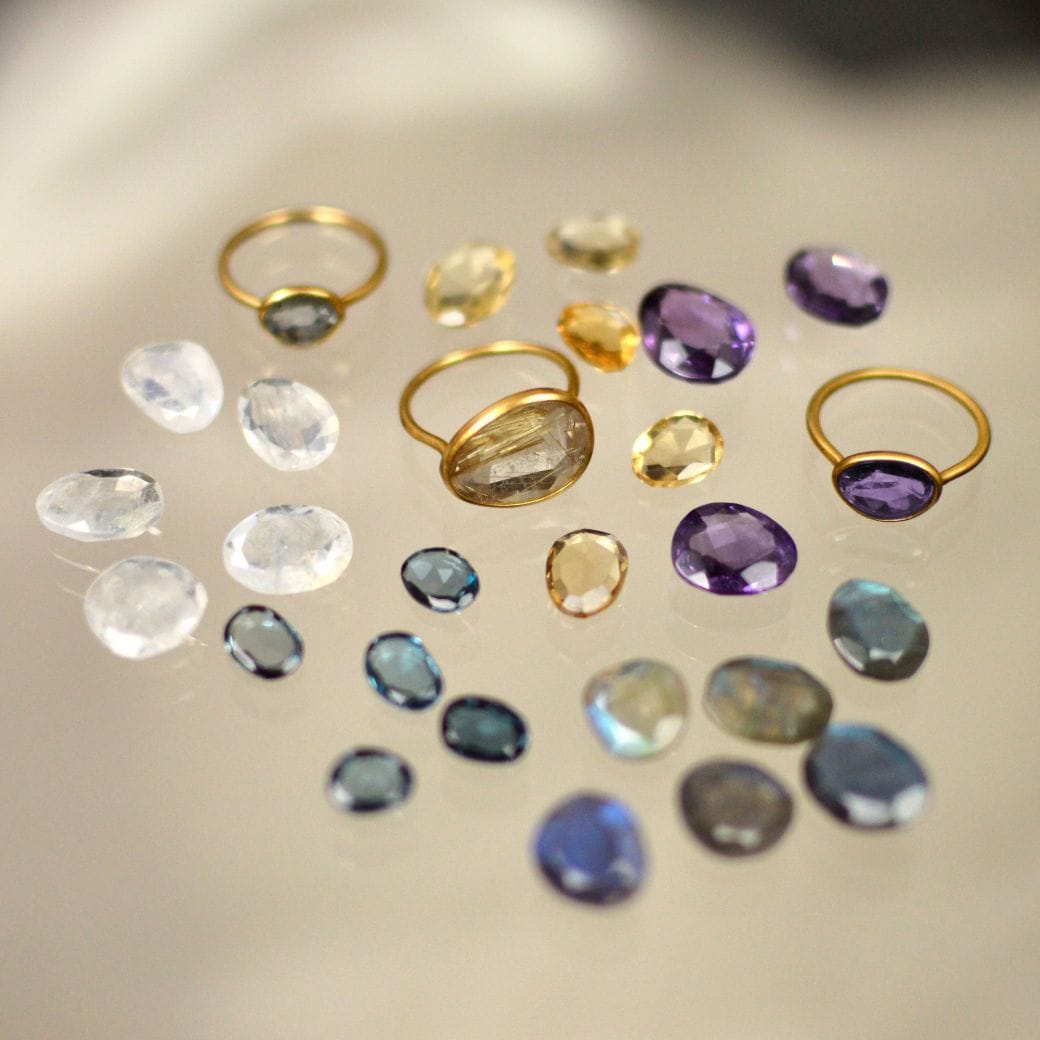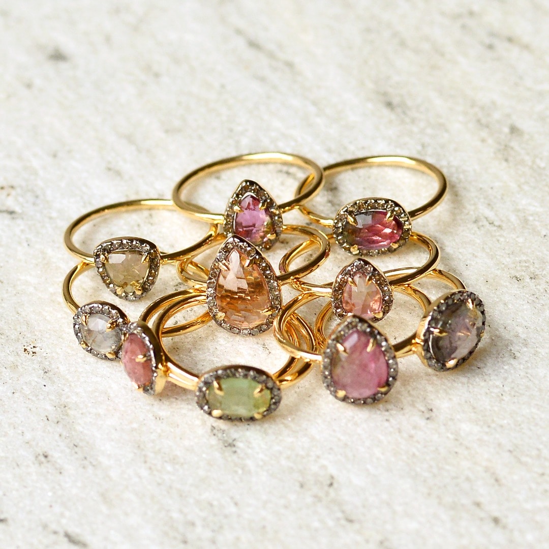 左:< pink tourmaline >昨年も人気を博した大振りのピンクトルマリンを使ったロマンチックな一点ものは、美しい照りと深い色味が魅惑的。ありのままの姿を活かした石の形や色味はすべてひとつひとつ異なる個性を放ちます。