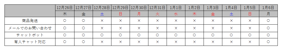 以降のお問い合わせは1月6日(月)以降順次返信させていただきます。